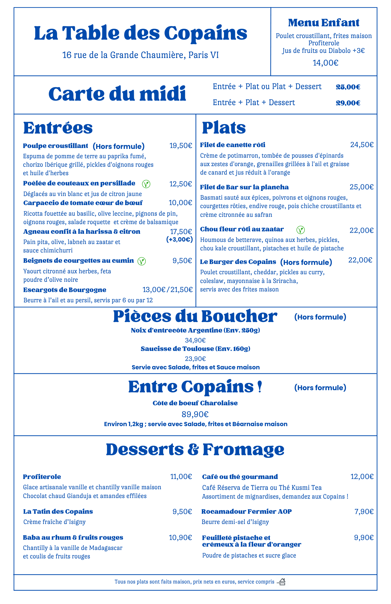 Liste des allergènes Suivez-nous sur instagram Contact contact@latabledescopains-paris.fr 01 43 54 31 45 Adresse 16 rue de la grande chaumière, 75006 Paris