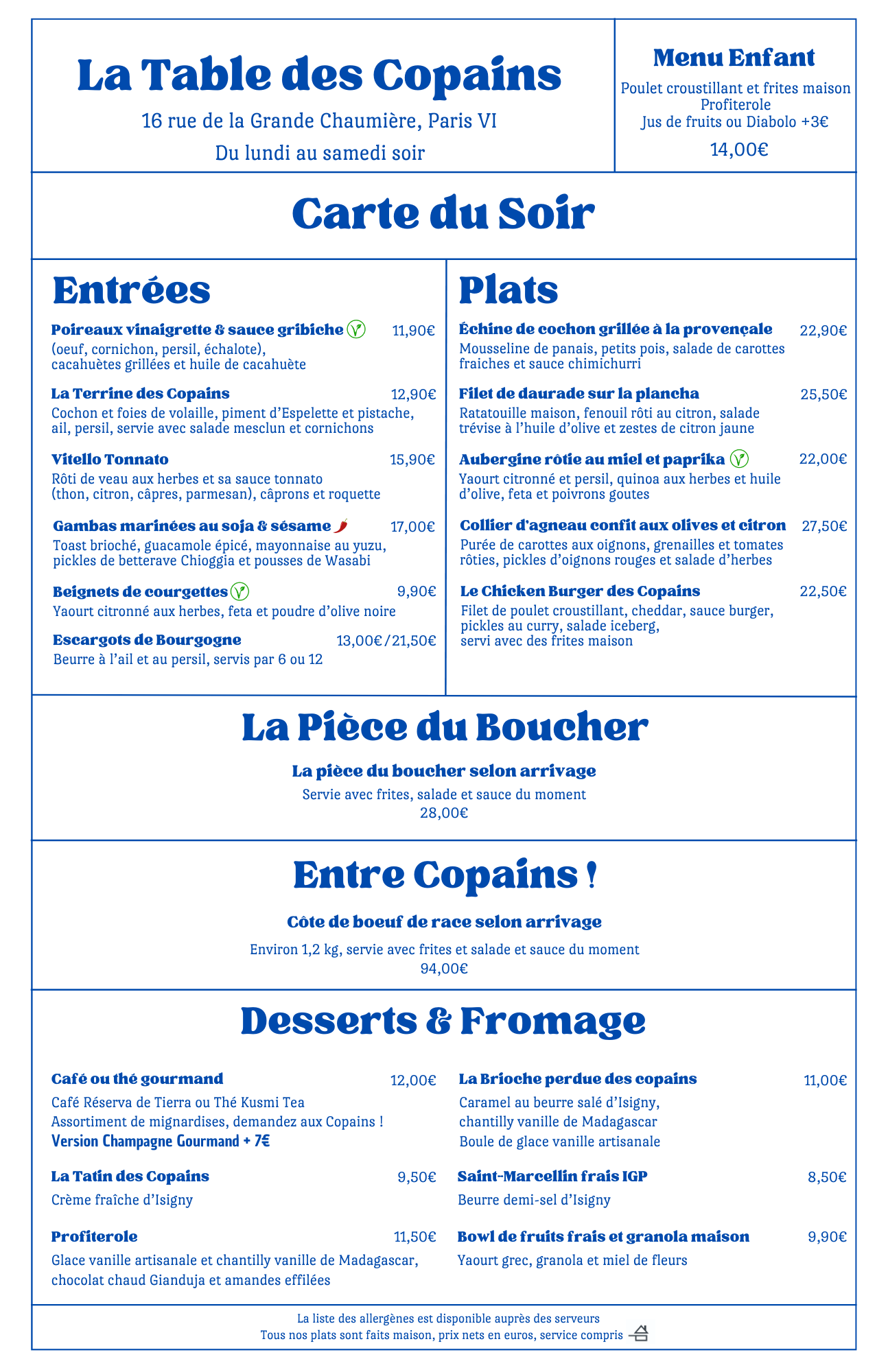 Liste des allergènes Suivez-nous sur instagram Contact contact@latabledescopains-paris.fr 01 43 54 31 45 Adresse 16 rue de la grande chaumière, 75006 Paris